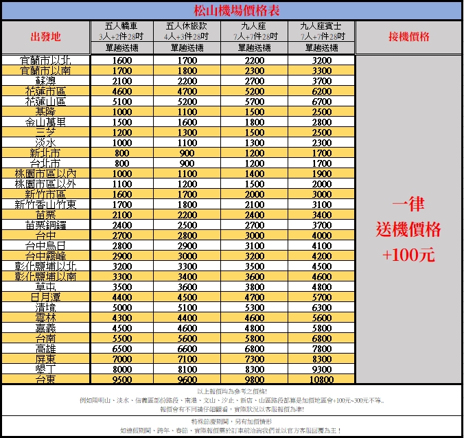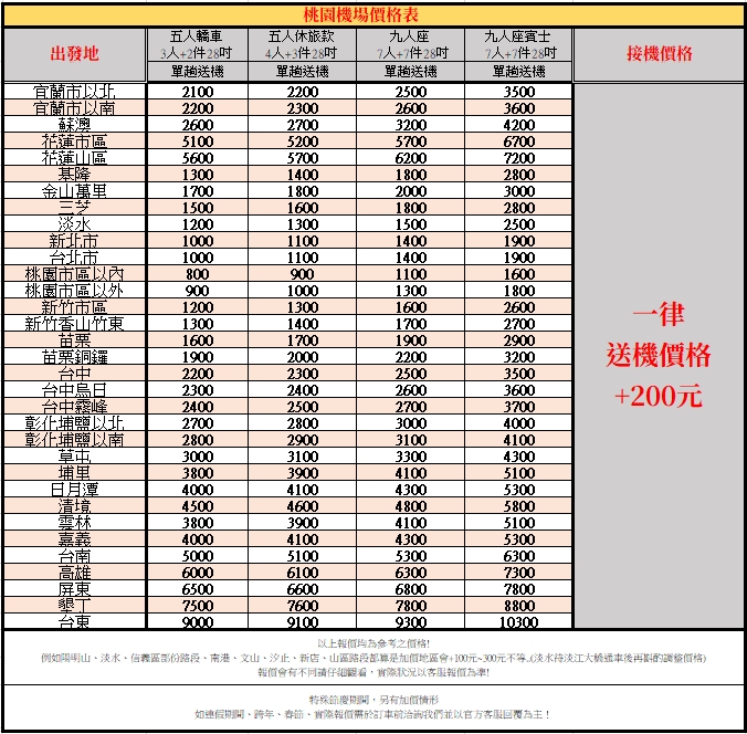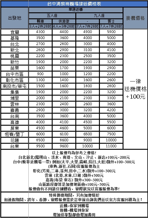 另外新增台中機場至各地區報價表 方便貴賓預先參考價格在考慮自身預算考量 以利安排
